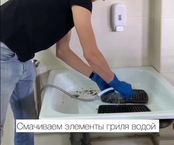 На нашем гриле есть 2 нагревательные пластины, которые, по-видимому, очень долго оставались без внимания. Очень жирные и с наслоениями нагара. Одну пластину мы будем мыть популярным средством “Fairy”, а вторую средством, которым пользуется компания “Фрэшрум”. Как всегда для наших тестов выставляются одинаковые временные условия. 5 минут для каждой из нагревательных пластин.