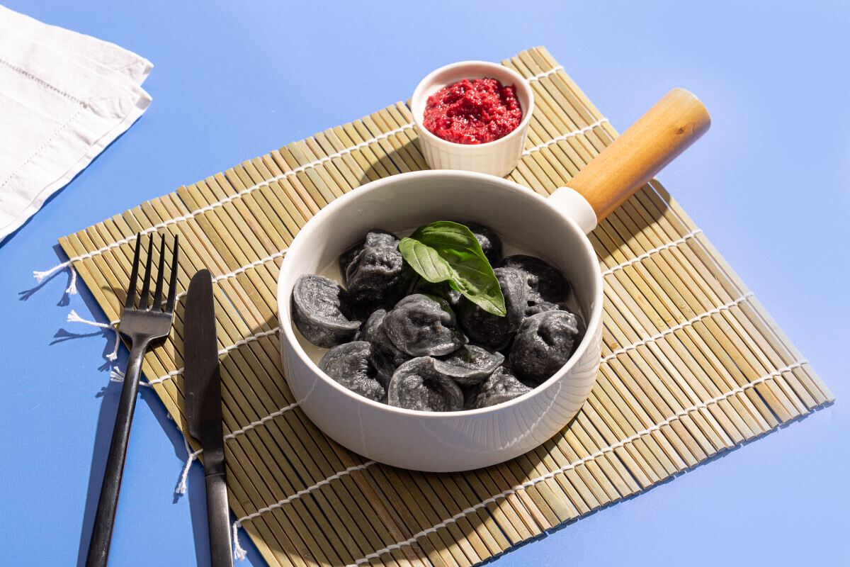 Повторяем дома тренд из модных пельменных! Совет: смешайте две части классического теста с одной частью чёрного, чтобы получить красивый мраморный узор. Ингредиенты на 8–10 порций:Для теста: